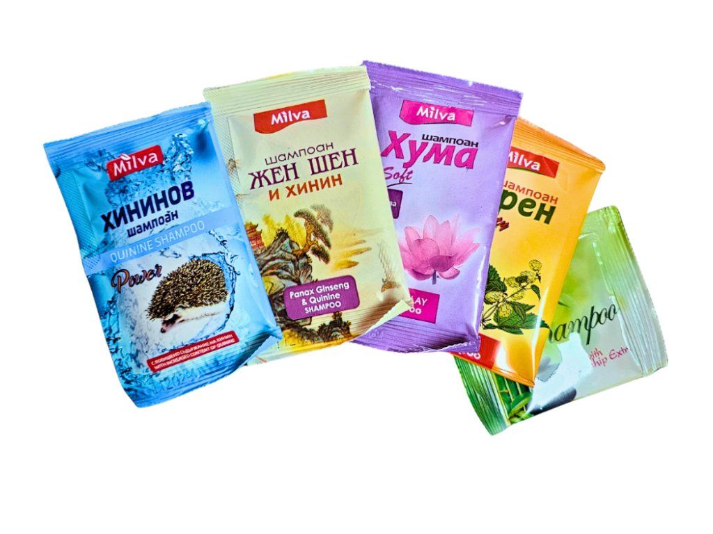 Milva - šampón chinín 12ml + šampón ženšen a chinín 12ml + šampón huma 12ml + šampón pivné droždie 12ml + šampón šípka 8 ml